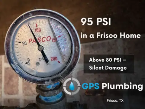 That level may feel strong at the tap, yet in Frisco homes sustained pressure above 80 PSI gradually weakens every valve, fitting, and appliance connected to your plumbing system.